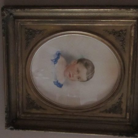 A very well done portrait of a child from the mid 1800’s. Since the lower part of the painting is unfinished, it is likely that the painting was done after the child died, a common custom of the time. The owner of the shop where we purchased this painting said it was by a prominent Tennessee artist who sometimes did watercolor portraits, but is is not marked and such verbal provenance is worthless, but it was surely done by an accomplished artist. The curly hair is beautifully done. The frame is from the period and both frame and painting are in very good condition. Approximately 16″ square overall.